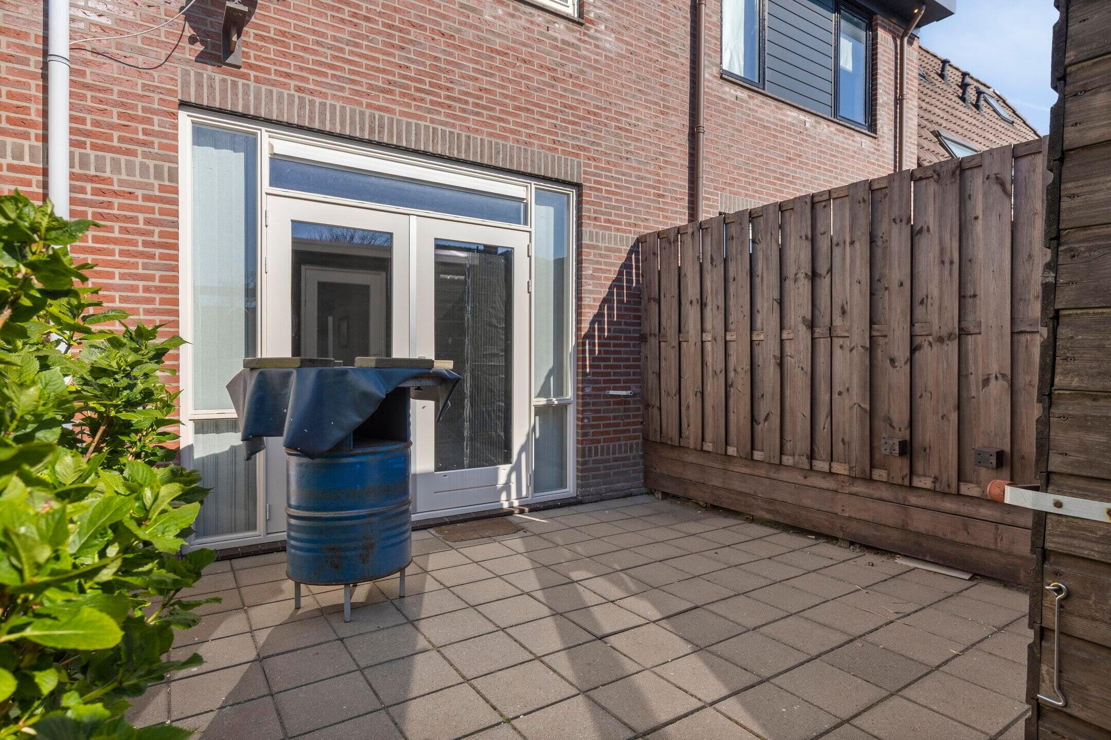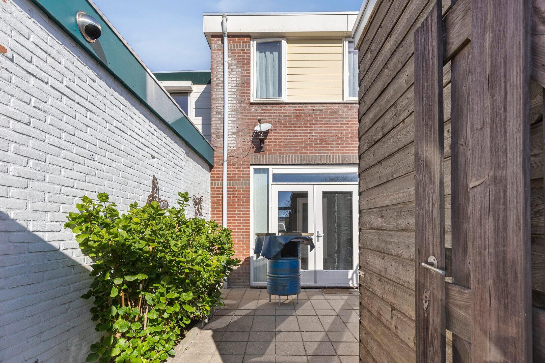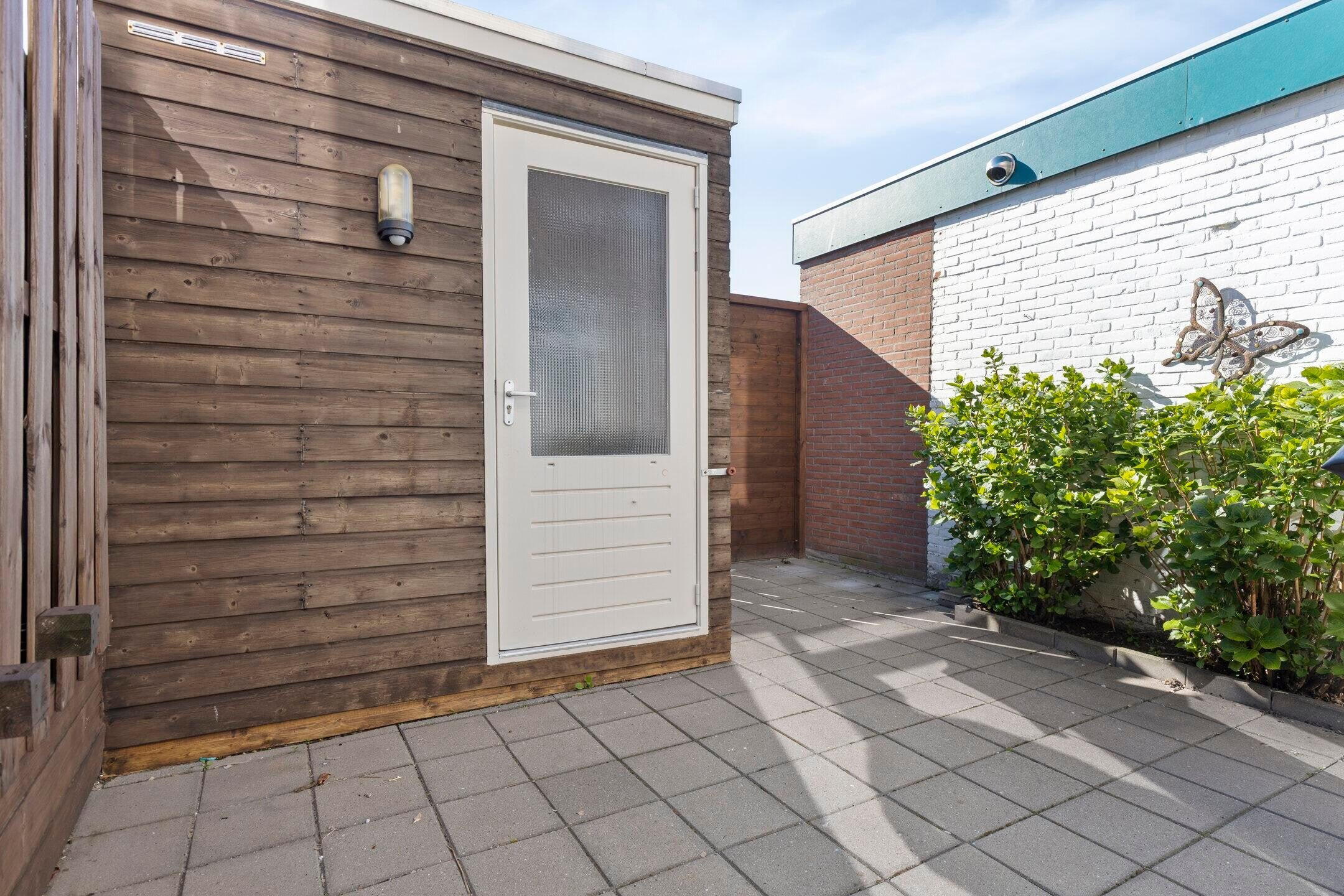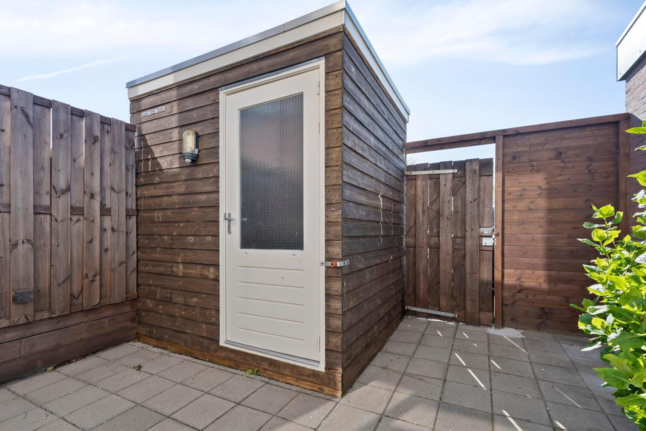 De achtertuin is volledig bestraat en daarmee onderhoudsvriendelijk ingericht. Achterin de tuin bevindt zich een vrijstaande houten berging, ideaal voor het stallen van fietsen of extra opslag. Tevens is er een achterom aanwezig, wat de tuin goed bereikbaar maakt.